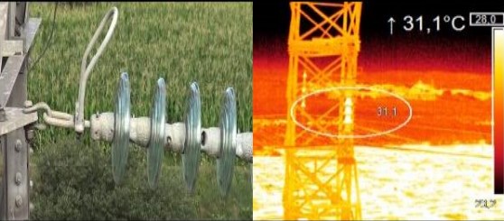 En la imagen anterior se aprecia en la fotografía térmica una falla en 3 piezas del aislador que reflejan puntos elevados de temperatura.