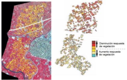 A continuación, en la fotografía se muestran 2 imágenes, por un lado la imagen de la izquierda entrega información sobre la situación de un cultivo posterior a la caída de una fuerte helada, y por otro lado la imagen de la derecha marca las diferencias de vegetación antes y después de la helada. Con esta información y a partir de los contrastes entre el antes y después de la helada es posible concluir si es que el plan de acciones fue el adecuado o si este necesita mejoras.