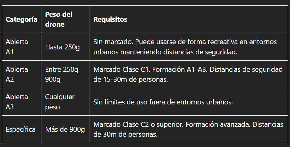 La nueva normativa Europea sobre el uso de drones establece diferentes categorías de vuelo en función del tipo de dron y su uso. En esta tabla se resumen las principales categorías y sus requisitos: